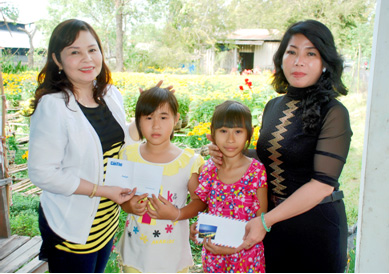 Chị Võ Thị Thanh Nhã (bìa trái) và chị Trần Thị Xuân (bìa phải) tặng quà Tết cho hai chị em trẻ mồ côi: Ngọc Đẹp và Bích Trâm. Ảnh: X.Đào |