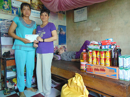 Chị Trần Thị Tuyết Lan (bên phải) trao quà và tiền cho gia đình bà Mai Thị Lòng. Ảnh: N.D
