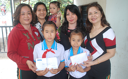 Các nhà hảo tâm trao tiền hỗ trợ hai em Ngọc Đẹp và Bích Trâm. Ảnh: X.Đào