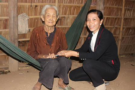 Bà Mai Thị Hiền, Phó Chủ tịch UBMTTQVN xã Nhơn Nghĩa, huyện Phong Điền trao tiền từ thiện của ông Nguyễn Văn Chương cho bà Nguyễn Thị A.