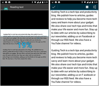 Google Keep là hữu ích nếu bạn thỉnh thoảng làm việc với các văn bản dạng hình ảnh. Nhưng nếu cần một ứng dụng mạnh mẽ hơn, tức là bạn muốn nhận dạng số lượng lớn văn bản trong hình ảnh, có lẽ bạn nên tìm đến ứng dụng Text Fairy. Sức mạnh của ứng dụng này là có thể nhận dạng và chuyển đổi hình ảnh sang text trong khoảng thời gian dường như không đáng kể. Điều quan trọng là hình ảnh cung cấp phải thật rõ nét để nó cho kết quả nhận dạng chính xác nhất. Bạn sẽ được hỏi có cần phân chia hai cột hay một cột thông thường, và sau đó ứng dụng sẽ bắt đầu nhận dạng.