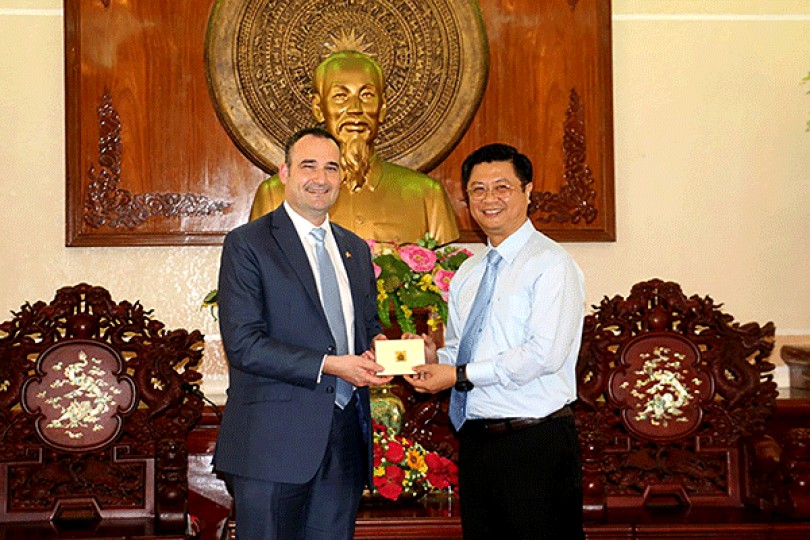Phó Chủ tịch UBND TP Cần Thơ Trương Quang Hoài Nam (phải) và Tổng Lãnh sự Canada tại TP Hồ Chí Minh Kyle Nunas trong cuộc gặp ngày 13-5 vừa qua. Ảnh: Nam Hương