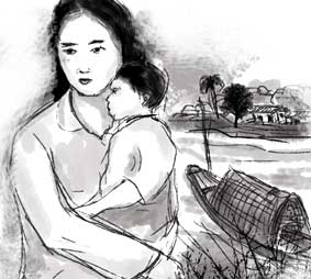 ". Rồi chị nằm xuống ôm con Nhi vào lòng, mái tóc dài phủ nửa bên mặt, qua ánh sáng mờ mờ của những ngọn đèn trên bến, tôi thấy vai chị run run.