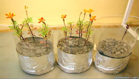Trồng thử nghiệm cúc vạn thọ trong đất được chế tạo từ đá giống như loại trên bề mặt Mặt trăng.