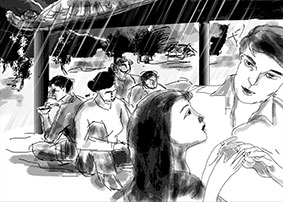 Mưa vẫn rơi, gió vẫn thổi nhưng không hung hãn như dự báo ban đầu. Trong đình làng, mọi người vẫn quây quần chờ cơn bão tan. Hình như bão đã đổi hướng. Ai cũng tin là ngày mai bầu trời sẽ quang đãng, nắng ấm chan hòa.