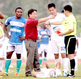 Phó Chủ tịch CLB Thanh Hóa (người đứng giữa) chỉ mặt trọng tài phản ứng bị phạt 5 triệu đồng và treo quyền chỉ đạo hai trận.