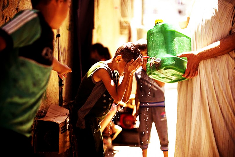 Một bé trai người Palestine rửa mặt bằng nguồn nước hiếm hoi. Ảnh: FP