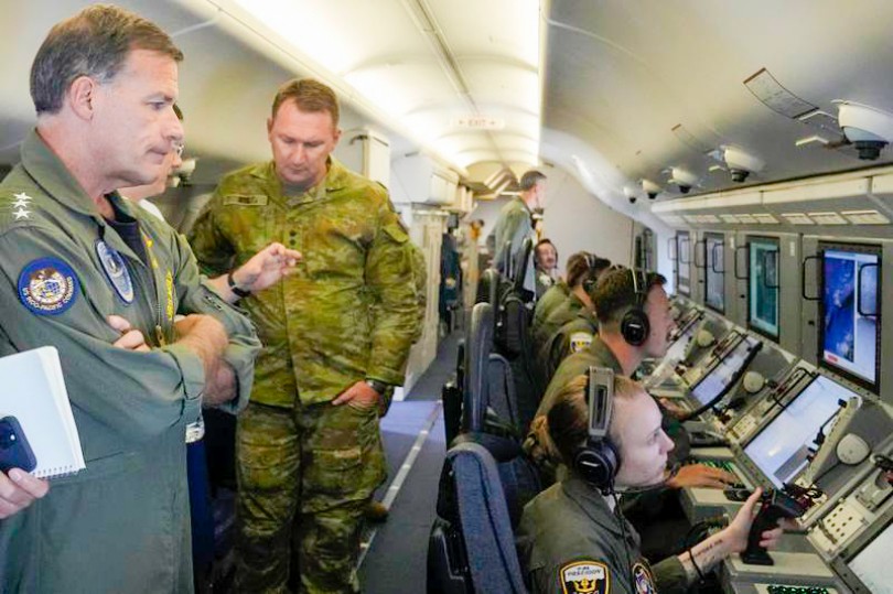 Đô đốc Aquilino (trái) quan sát các công trình xây dựng của Trung Quốc trên Biển Đông từ máy bay tuần tra P-8A Poseidon hôm 20-3. Ảnh: AP