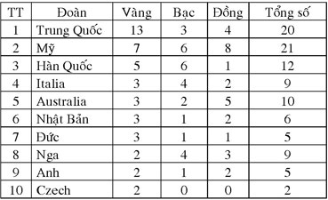 Dưới đây là bảng xếp hạng huy chươngcủa 10 đoàn tạm dẫn đầu tại Olympic 2008 (tính đến 22 giờ ngày 12-8):