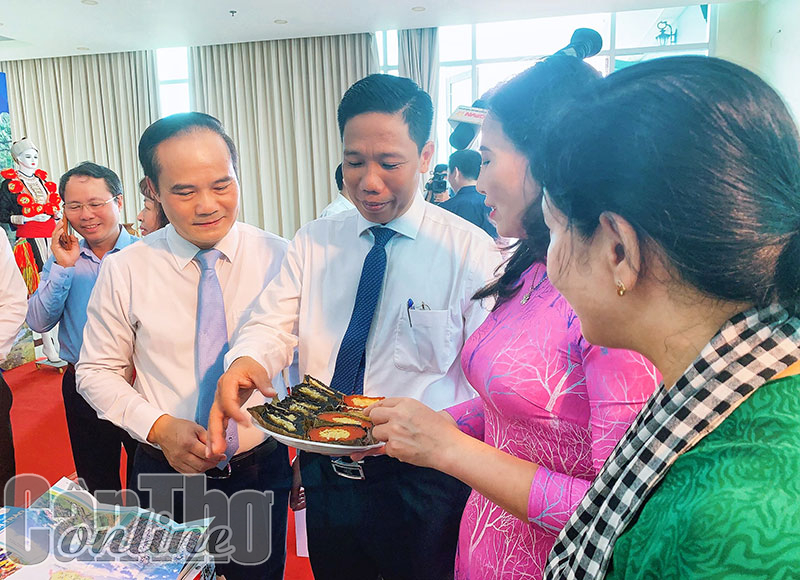 Lãnh đạo TP Cần Thơ và tỉnh Tuyên Quang tham quan tại các gian hàng quảng bá du lịch, đặc sản. Ảnh: Kiều Mai