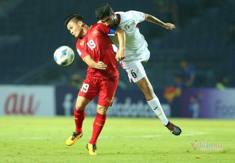 Quang Hải (trái) tranh bóng với cầu thủ Jordan. Ảnh: VNN
