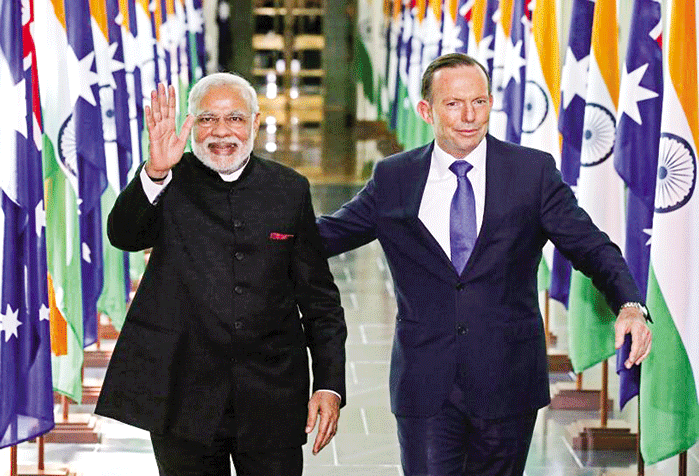 Thủ tướng Modi (trái) và cựu lãnh đạo Úc Abbott. Ảnh: AP