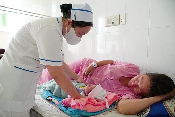 Bệnh viện Sản Nhi Hậu Giang có nhiều cải tiến ứng dụng công nghệ số. Trong ảnh: Cử nhân hộ sinh Trần Thị Lan Xiêm chăm sóc sức khỏe sản phụ.