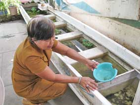 Trong ảnh: Chị Loan đang chăm sóc cá bảy màu phát cho các hộ dân diệt lăng quăng. |
