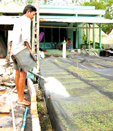 Ông Cường cho biết, tháng 10 vô vụ cải Tết, tháng 2 lai rai, các tháng 3-4-5-6-7 sản xuất nhiều nhờ mưa và có ít sâu bọ. Nghề này khi khởi phát khá vất vả. Hồi đó cắt lá chanh lót bầu, rất cực và mất nhiều thời giờ, sau này nghĩ ra vỉ lưới cước. Rồi nghĩ ra cách đậy lưới cước nhằm hạn chế sâu bọ, khi tưới xịt bằng máy bơm không “động” nhiều đến rau cải giống còn non, lại đỡ khiêng ra khiêng vô nhọc nhằn...