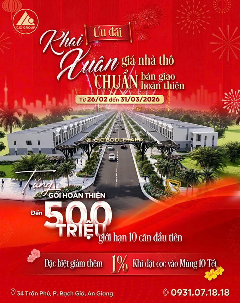 Từ ngày 26-2 đến 31-3-2026, CIC Group triển khai chương trình: “Ưu đãi khai xuân: Giá nhà thô - Chuẩn bàn giao hoàn thiện” cho khách hàng mua nhà tại Dự án tuyến dân cư đường số 2 - CIC Boulevard.