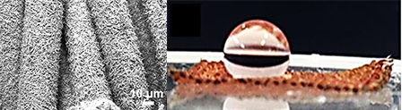 Cấu trúc nano bao phủ trên bề mặt vải và thử nghiệm cho thấy nước không thấm lên bề mặt vật liệu. Ảnh: Gizmag