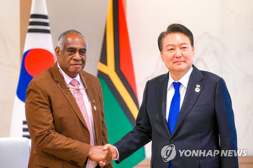Tổng thống Hàn Quốc Yoon Suk-yeol (phải) và Thủ tướng Vanuatu Ishmael Kalsakau trong cuộc gặp hôm 28-5 tại thủ đô Seoul.