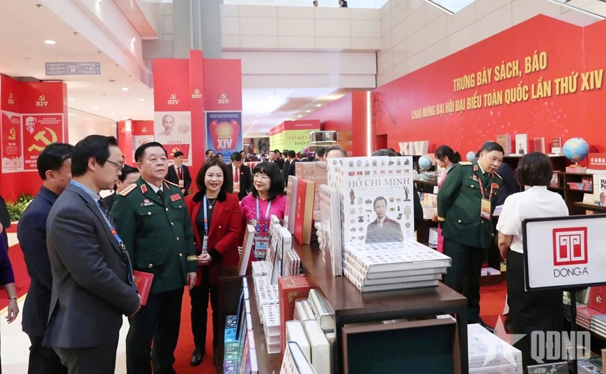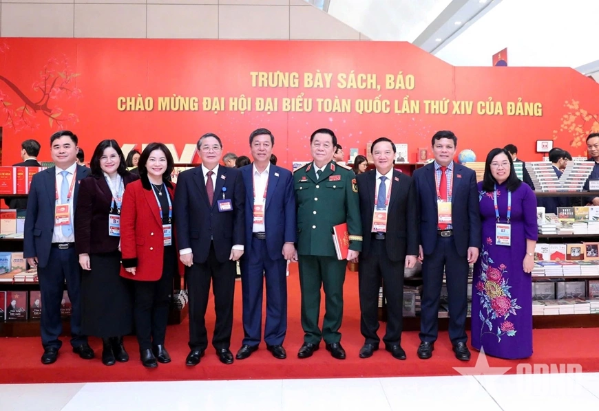 Đại tướng Nguyễn Trọng Nghĩa và đại biểu tham quan trưng bày sách, báo chào mừng Đại hội XIV của Đảng. Ảnh: TRỌNG HẢI