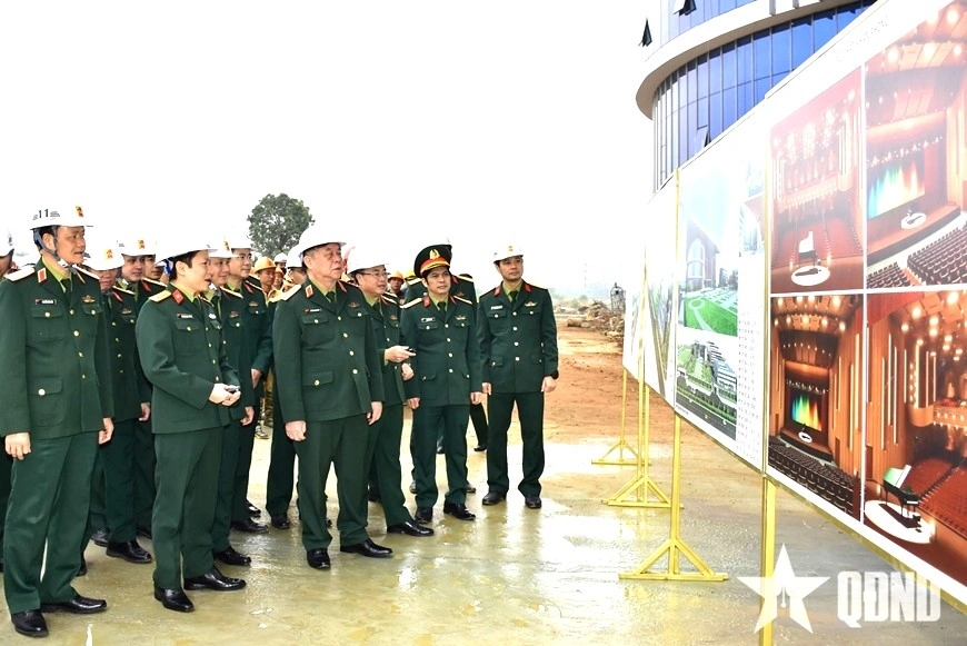 Đại tướng Nguyễn Trọng Nghĩa kiểm tra công tác thi công dự án Nhà hát Nghệ thuật thực nghiệm, Trường Đại học Văn hóa Nghệ thuật Quân đội (cơ sở Hòa Lạc, Hà Nội), tháng 2-2026. Ảnh: HOÀNG VIỆT