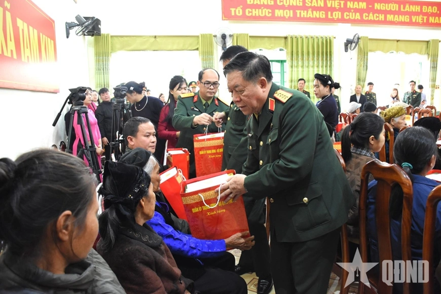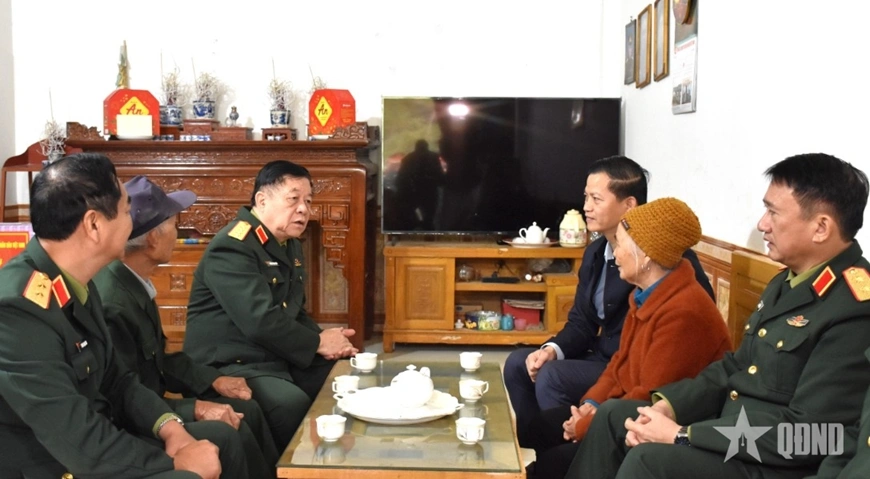 Đại tướng Nguyễn Trọng Nghĩa đến thăm, tặng quà gia đình bà Triệu Thị Cầm, hộ dân sinh sống gần Khu di tích hầm Năm Cửa (xóm Khau Diều, xã Bình Yên, tỉnh Thái Nguyên).