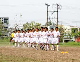 Đội tuyển bóng đá trung học của TP Cần Thơ tập luyện trên mặt sân đầy cát bụi...