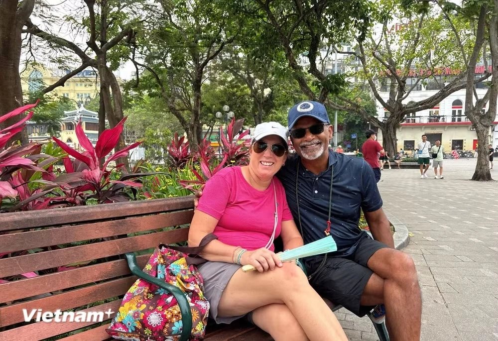 Hai vợ chồng du khách Canada là Donna và Lu tham quan phố đi bộ Hồ Gươm, Hà Nội. (Ảnh: Mai Huyền/Vietnam+)