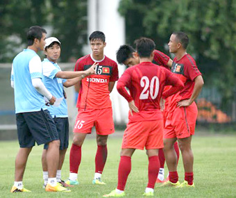 HLV Miura hướng dẫn các học trò trong buổi tập trước ngày đi Malaysia. Ảnh: bongda |