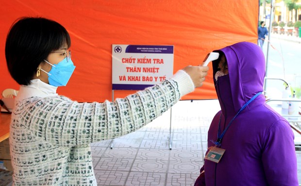 Kiểm tra thân nhiệt cho người ra vào bệnh viện. (Nguồn: TTXVN)