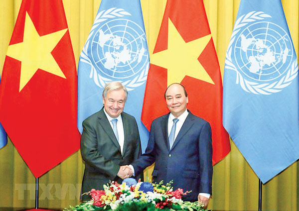 Chủ tịch nước Nguyễn Xuân Phúc và Tổng Thư ký LHQ Antonio Guterres trong chuyến thăm Việt Nam hồi tháng 10-2022. Ảnh: TTXVN