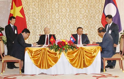 Tổng Bí thư Nguyễn Phú Trọng và Tổng Bí thư, Chủ tịch nước Lào Bounhang Volachith chứng kiến Lễ ký kết các văn kiện hợp tác giữa hai nước . |