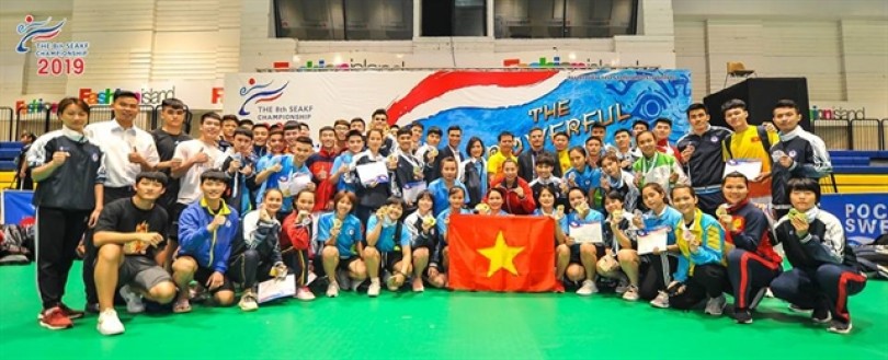 Vietnamese athletes pose for a group photo after winning the eighth Southeast Asian Karate Federation Championship in Bangkok, Thailand. (Photo: Thailand Karate Federation)