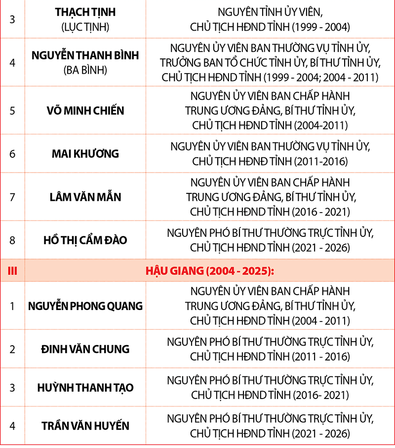 (Nguồn: Lịch sử Đảng bộ thành phố Cần Thơ, tập IV (1975-2010); Văn phòng Đại biểu Quốc hội và Hội đồng nhân dân thành phố Cần Thơ)