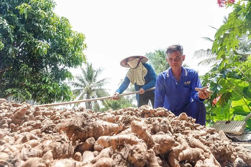 Vợ chồng ông Tám phơi nghệ dùng làm dược liệu. Ảnh: DUY KHÔI
