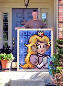 Một người mê chơi trò Super Mario (hái nấm và đi cứu công chúa) đã bỏ ra nhiều tháng sưu tập các nắp chai nhựa để lắp ghép thành bức chân dung công chúa Peach dễ thương (ảnh). Với sự giúp đỡ của gia đình, Skeplin, một thành viên của trang mạng Instructables, đã tập hợp được khoảng 1.000 nắp chai. Con của ông đã giúp chùi rửa, còn ông lo chuẩn bị 26 màu cần thiết cho bức lắp ghép. Người đàn ông ở Ohio (Mỹ) này đã dùng chương trình thao tác ảnh Perl và ImageMagick để định dạng vị trí các màu sắc trước khi sơn màu lên các nắp chai. Sau đó, Skeplin dùng keo để dán từng nắp chai vào đúng vị trí của nó trên khung hình. Ông rất tự hào khi có được bức chân dung lắp ghép đặc biệt này để treo trong nhà, cũng là góp phần nhỏ bảo vệ môi trường.