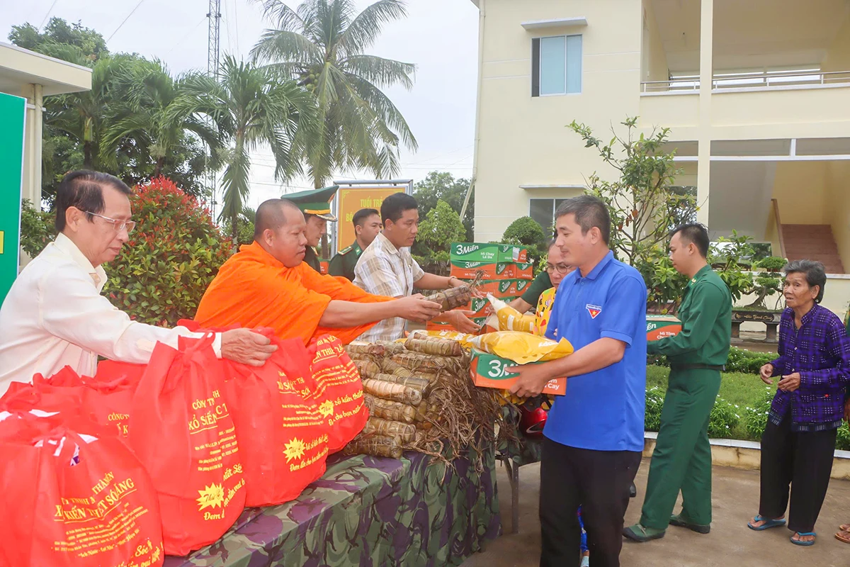 Sư sãi cùng cán bộ biên phòng trao quà cho hộ nghèo tại xã Vĩnh Hải. Ảnh: Lý Then