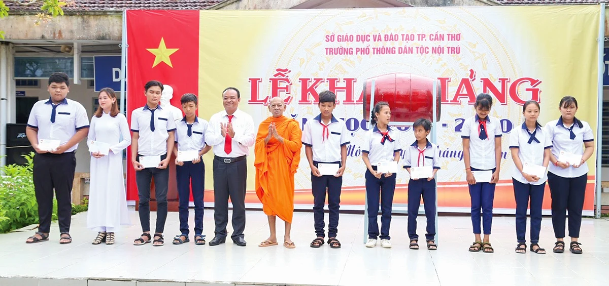 Lớp trẻ dân tộc Khmer luôn được quan tâm, tạo điều kiện học tập, nâng cao trình độ để đóng góp cho cộng đồng, cho phum sóc ngày càng phát triển. Trong ảnh: Nhiều học sinh Trường Phổ thông Dân tộc Nội trú TP Cần Thơ được nhận học bổng "Tiếp sức đến trường" vào đầu năm học mới. Ảnh: T.Long