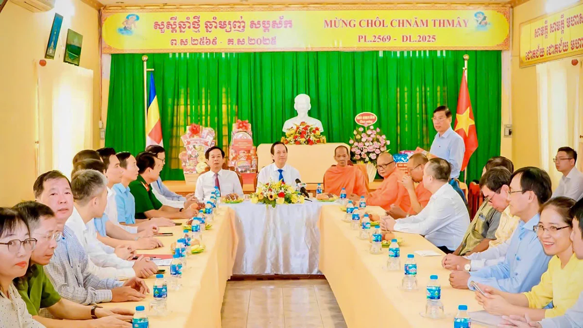 Lãnh đạo Bộ Dân tộc và Tôn giáo, lãnh đạo TP Cần Thơ thăm và chúc Tết cổ truyền dân tộc Khmer - Chôl Chnăm Thmây 2025 tại Hội Đoàn kết sư sãi yêu nước TP Cần Thơ. Ảnh: CTV