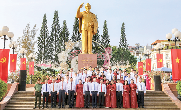 Đoàn đại biểu TP Cần Thơ dự Đại hội XIV của Đảng viếng Tượng đài Chủ tịch Hồ Chí Minh (bến Ninh Kiều). Ảnh: Q. THÁI