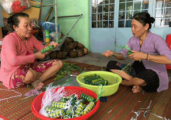 Hằng ngày, cô Loan (bên trái) gói bánh tét bán dạo, có thu nhập để chăm lo cuộc sống.
