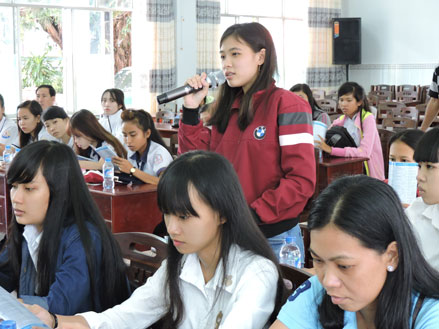 Học sinh trình bày ý kiến đối với việc chọn ngành học và cơ hội việc làm trong buổi giao lưu định hướng nghề nghiệp tại lễ trao học bổng. |