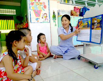 Cô Trần Thị Trúc Linh đang kể chuyện cho trẻ. Ảnh: THU HẰNG |