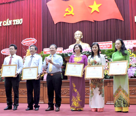 Ông Trần Việt Trường, Trưởng Ban Tuyên giáo Thành ủy Cần Thơ trao Bằng khen của Bộ Giáo dục và Đào tạo cho đại diện tập thể có thành tích xuất sắc trong
