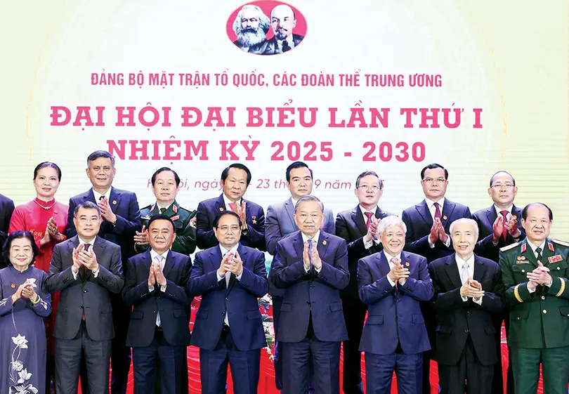 Tổng Bí thư Tô Lâm, Thủ tướng Chính phủ Phạm Minh Chính và các đại biểu dự Đại hội đại biểu Đảng bộ MTTQ, các đoàn thể Trung ương lần thứ I, nhiệm kỳ 2025-2030. Ảnh: Thống Nhất (TTXVN)