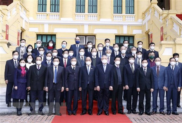 Chủ tịch nước Nguyễn Xuân Phúc chụp ảnh chung với các đại biểu tham dự hội thảo. (Ảnh: Thống Nhất/TTXVN)