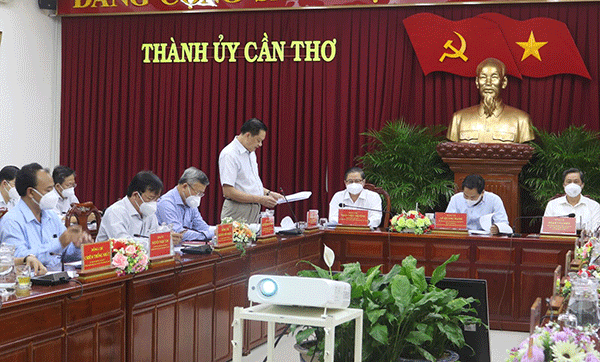Phó Chủ tịch Thường trực UBND TP Cần Thơ Dương Tấn Hiển báo cáo công tác phòng, chống dịch COVID-19.