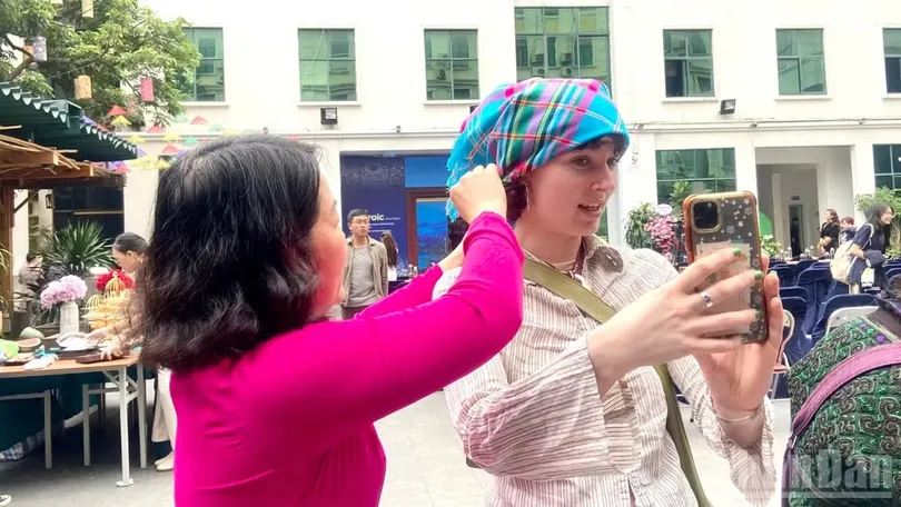 Du khách quốc tế bày tỏ sự thích thú khi được trải nghiệm và tìm hiểu về trang phục của người dân Tây Bắc tại Bảo tàng Phụ nữ Việt Nam. (Ảnh: CHIÊU ANH)