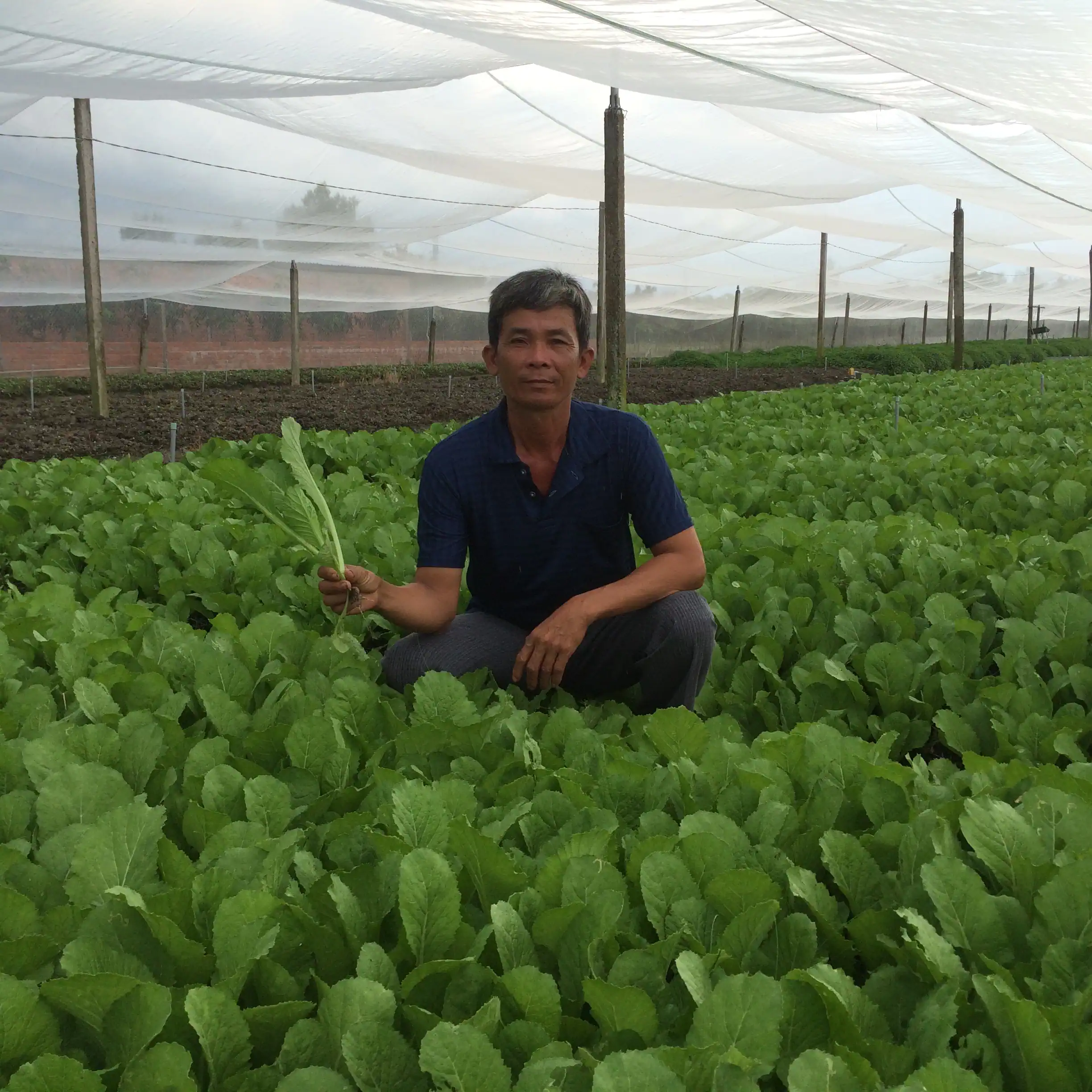 Khu vực trồng rau màu trong nhà lưới của ông Lắm có diện tích 2,5 công được phủ kín bởi màu xanh của các loại rau cải đang chờ ngày thu hoạch. Hơn 14 năm trồng rau cải, ông Lắm từng thắc thỏm về thời tiết, sâu bệnh tấn công... Từ năm 2017, ông Lắm đầu tư làm nhà lưới, hệ thống tưới nước 2,5 công ruộng với chi phí 60 triệu đồng để chuyển sang trồng màu chuyên canh. Nhờ ứng dụng mô hình trồng rau trong nhà lưới, năng suất cao gấp nhiều lần so với cách trồng truyền thống. Ông Lắm cho biết: “Ưu điểm của việc trồng rau trong nhà lưới, người trồng điều tiết được nhiệt độ, khắc phục được dịch bệnh, ít sâu hại, hạn chế phun thuốc nên các loại rau đạt năng suất cao, chất lượng đảm bảo”.
