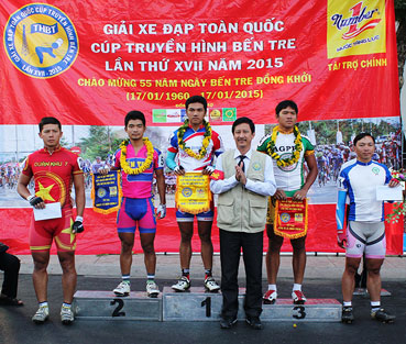 VĐV Lê Văn Động (bìa phải) của đội tuyển xe đạp Cần Thơ nhận thưởng thành tích lọt vào tốp 5 VĐV về đích đầu tiên chặng 5 Giải xe đạp Cúp truyền hình Bến Tre lần XVII-2015. |