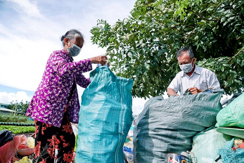 Cô chú Tư Ðào đang phân loại ve chai.